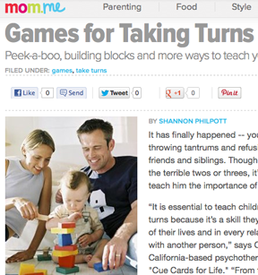 “It is essential to teach children how to take turns because it’s a skill they will use for the rest of their lives and in every relationship they share with another person,” says Christina Steinorth, a California-based psychotherapist and author of “Cue Cards for Life.” “From the school yard to dating to marriage to the work place, the concept of give and take is a key factor in forming healthy relationships with others.”