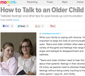“Teens and older children need to hear the truth about their parents’ feelings in their divorce, and it’s tricky, as parents need to disclose these feelings without being overly insulting to the other parent,” says Dr. John Duffy, Chicago-based psychotherapist and author of “The Available Parent.”