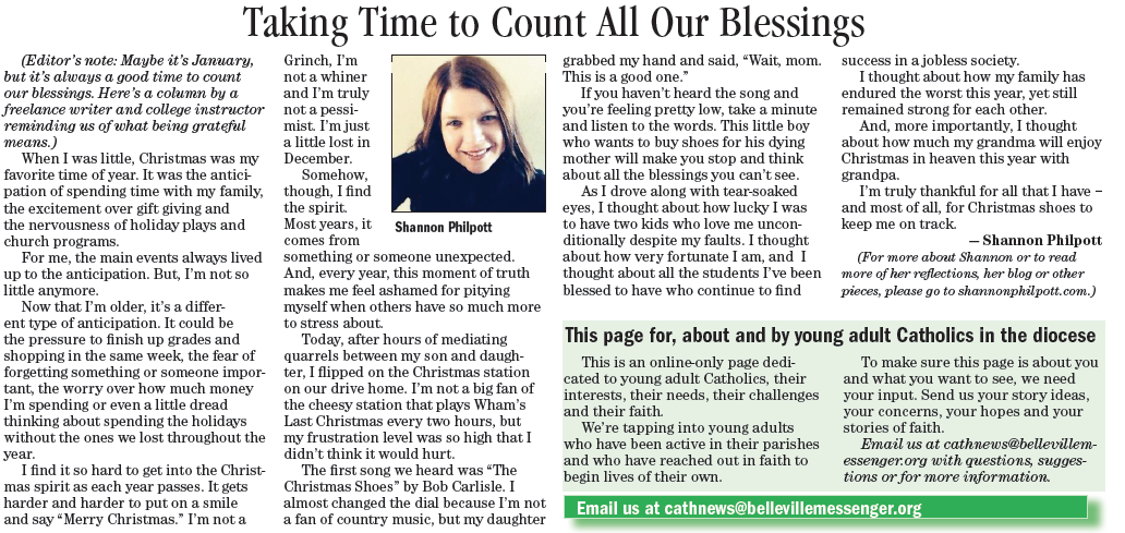 (Editor’s note: Maybe it’s January, but it’s always a good time to count our blessings. Here’s a column by a freelance writer and college instructor reminding us of what being grateful means.)